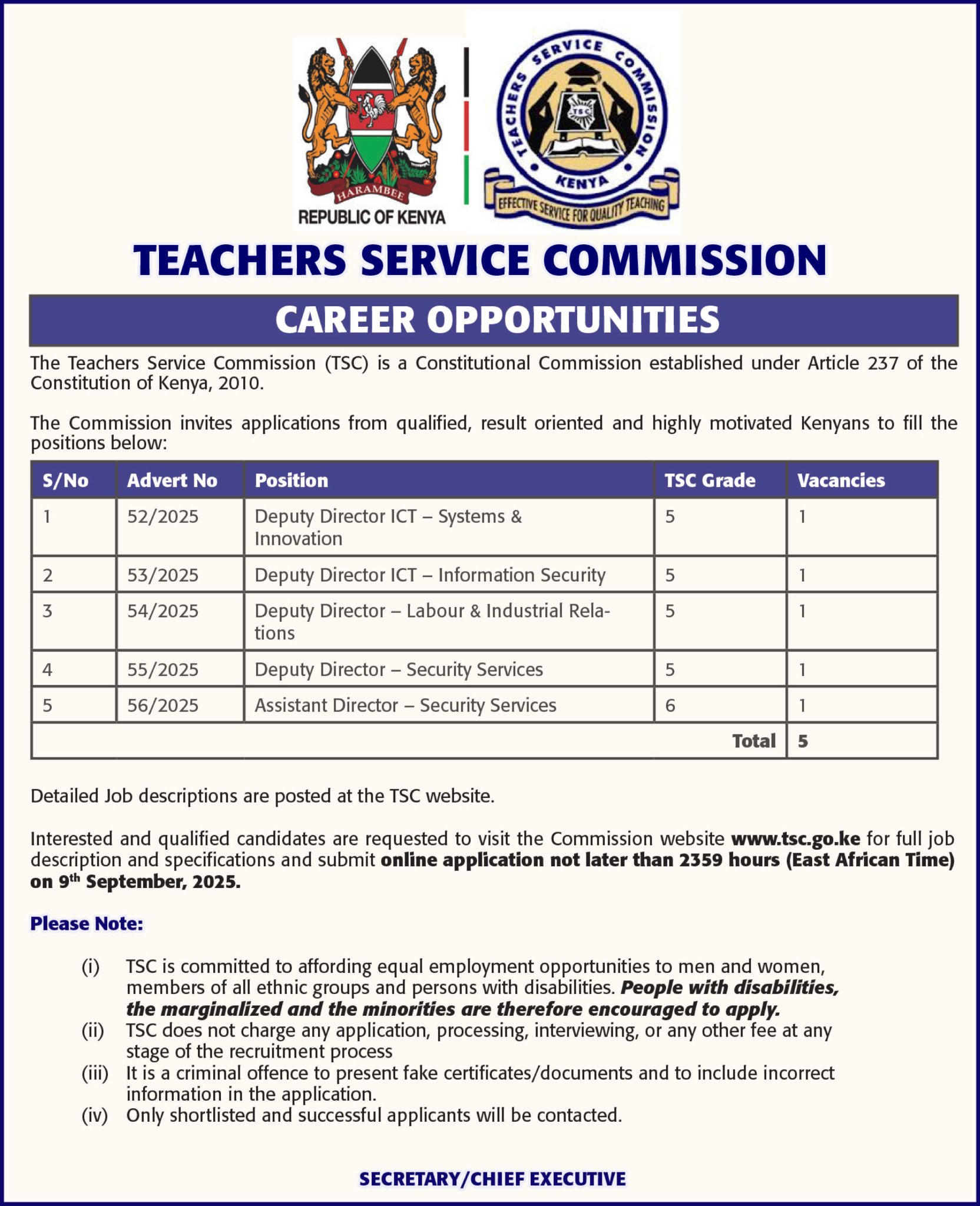 - Visit the TSC website: www.tsc.go.ke for full job descriptions and specifications